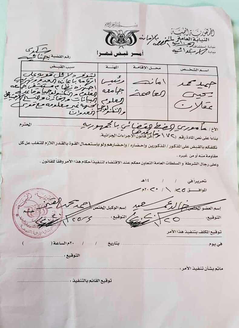 وحصل”يمني برس” على “وثيقة” قضائية صدرت عن المحكمة الجزائية المتخصصة بالأمانة بتاريخ 25/1/2020م بالقبض القهري على “عقلان” بعد ثبوت تورطه في تهريب أجهزة نظام مستشفى جامعة العلوم والتكنولوجيا وقاعدة البيانات والمخازن والنسخ الإحتياطي حسبما توضحه الوثيقة المرفقة.