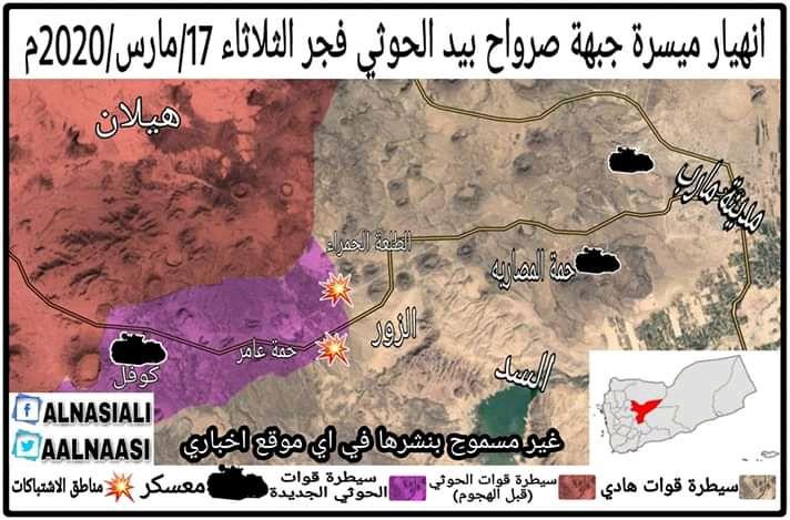 وتظهر الخريطة سيطرة الجيش واللجان على معسكر كوفل وحمة عامر مؤكدا انهيار ميسرة صرواح،فيما أفادت مصادر عن سيطرة الجيش واللجان الشعبية على الطلعة الحمراء .