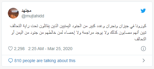 المغرد مجتهد يعلن عن تفشي ‘كورونا’ بين مرتزقة العدوان في #جيزان و #نجران