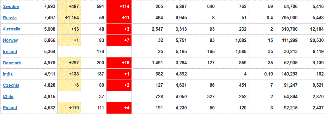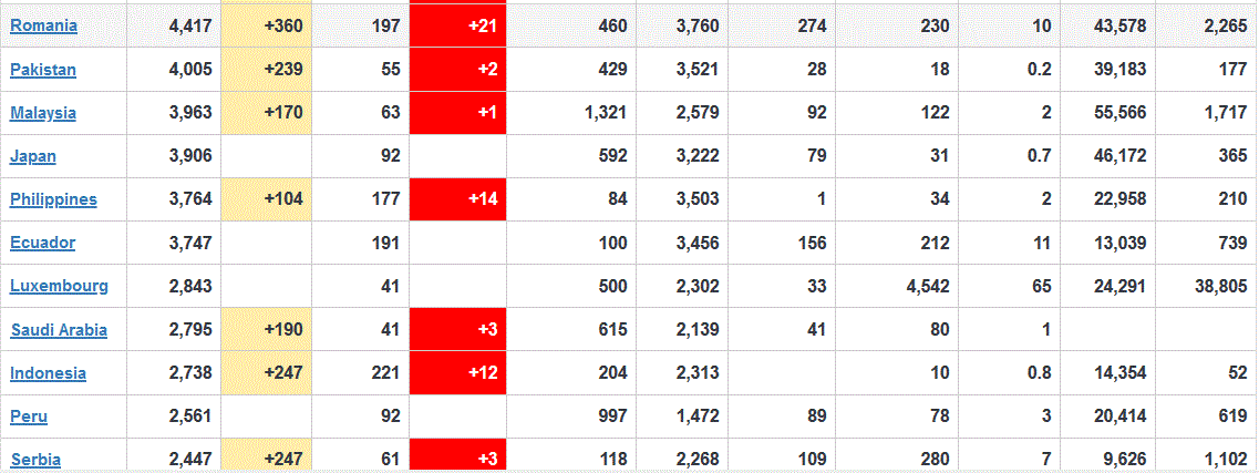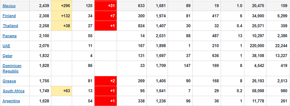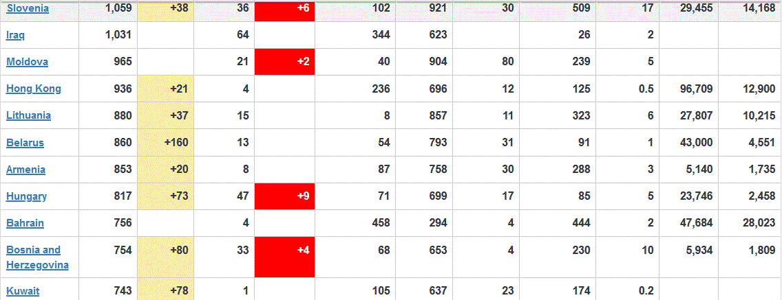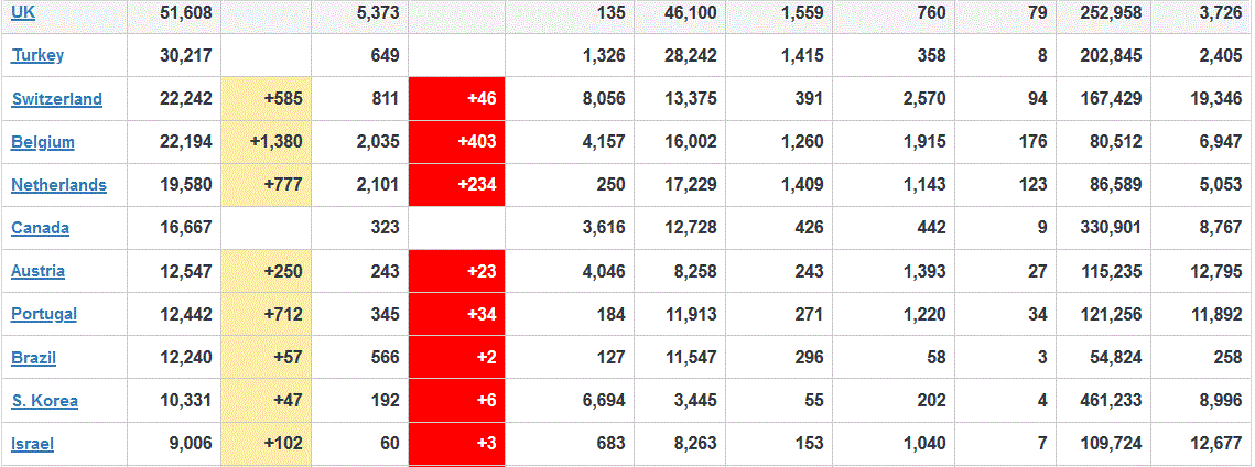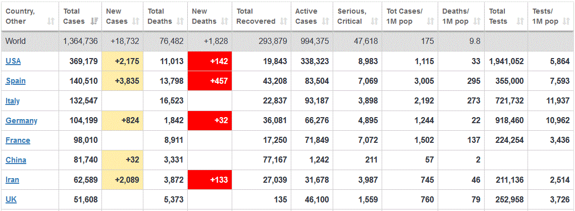 وكانت الصين لأول مرة أعلنت اليوم أنها لم تسجل أي حالة وفاة جديدة وكذلك ايطاليا وفرنسا والمملكة المتحدة ، كما تراجعت حالات الاصابة في عدد من الدول أبرزها الولايات المتحدة التي سجلت يوم أمس 30,331 حالة اصابة جديدة و 1,255 حالة وفاة بينما وصلت حالات الاصابة الجديدة حتى منتصف اليوم 2500 حالة بينما سجلت 140 حالة وفاة.