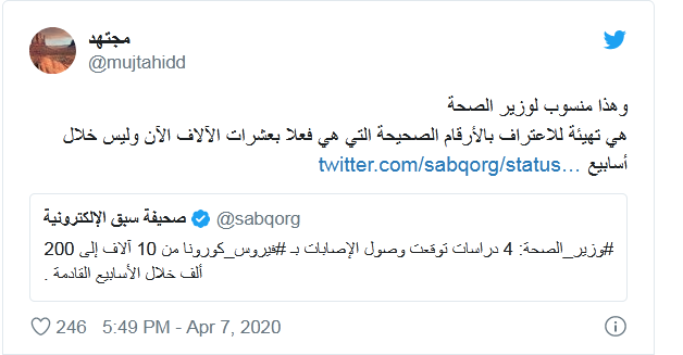 اعتبر المغرد الشهير “مجتهد” تصريحات وزير الصحة السعودي الذي قال ان 4 دراسات توقعت وصول الإصابات بفيروس كورونا من 10 آلاف إلى 200 ألف خلال الأسابيع القادمة اعتبره تهيئة للاعتراف بالأرقام الصحيحة في بلاده.