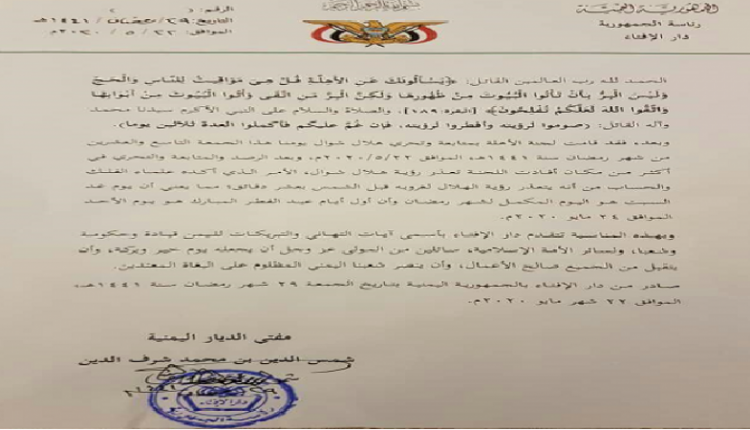 أعلنت دار الإفتاء بالجمهورية اليمنية مساء اليوم الجمعة، أن يوم غد السبت هو المكمل لشهر رمضان لتعذر رؤية هلال شوال وأن يوم الأحد الموافق 24 مايو هو أول أيام عيد الفطر المبارك.