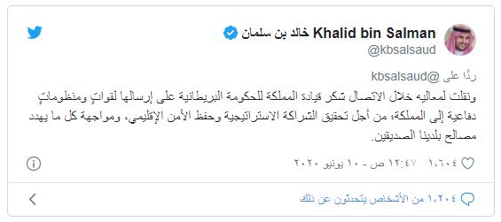 وقال نائب وزير الدفاع السعودي، في تغريدة له عبر “تويتر”، إنه نقل شكر الملك “سلمان بن عبدالعزيز” إلى للحكومة البريطانية على إرسالها لقواتٍ ومنظوماتٍ عسكرية إلى المملكة؛ من أجل تحقيق الشراكة الاستراتيجية وحفظ الأمن الإقليمي، ومواجهة “كل ما يهدد مصالح بلدينا الصديقين” حسب تعبيره.