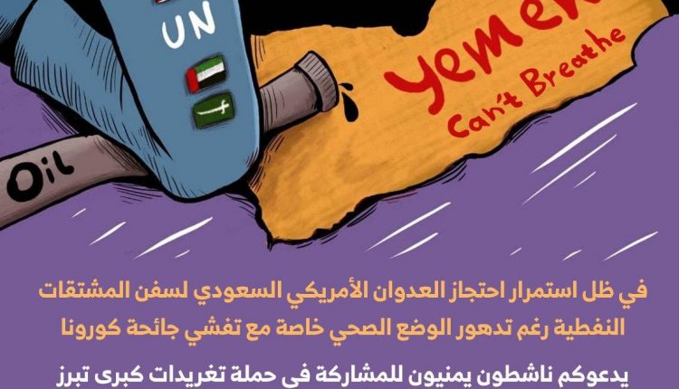 وأكد الناشطون ضرورة المشاركة في حملة التغريدات التي تنطلق الساعة التاسعة من مساء اليوم الثلاثاء ، في ظل استمرار العدوان الأمريكي السعودي في احتجاز سفن المشتقات النفطية، رغم تدهور الوضع الصحي خاصة مع تفشي جائحة كورونا على هاشتاق: