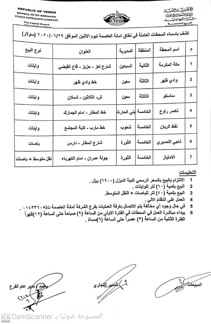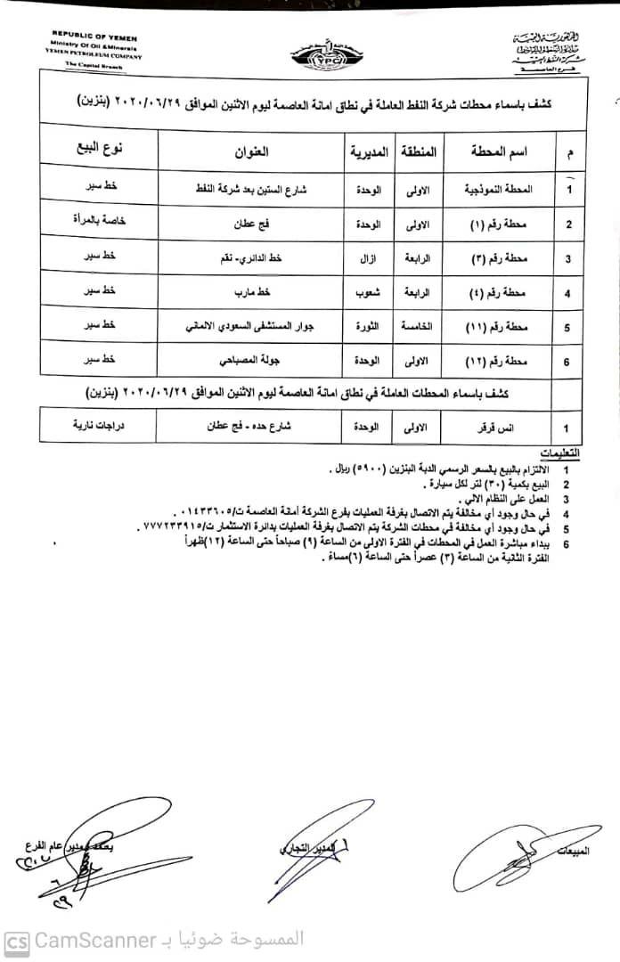 نشرت شركة النفط اليمنية كشوفات بأسماء المحطات العاملة في أمانة العاصمة “بنزين + ديزل” ليوم الاثنين 29 يونيو 2020م.
