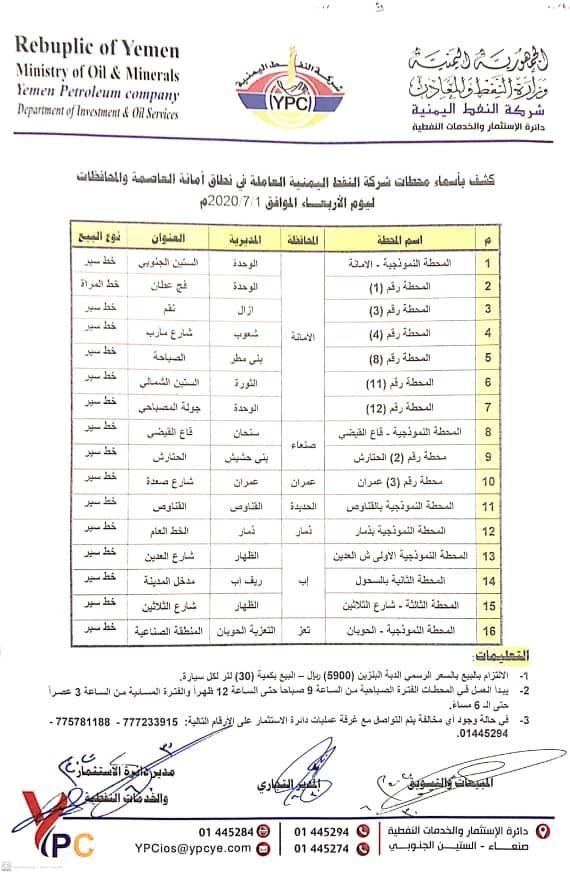 نشرت شركة النفط اليمنية كشوفات بأسماء المحطات التابعة للشركة العاملة في نطاق أمانة العاصمة والمحافظات “بنزين” ليوم الاربعاء 1 يوليو 2020م.
