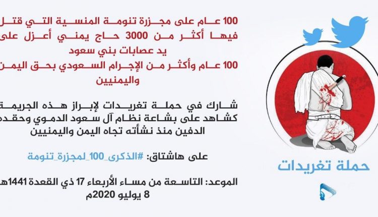 ودعا ناشطون للمشاركة في حملة التغريدات لإبراز هذه الجريمة كشاهد على بشاعة نظام آل سعود الدموي وحقده الدفين منذ نشأته تجاه اليمن واليمنيين