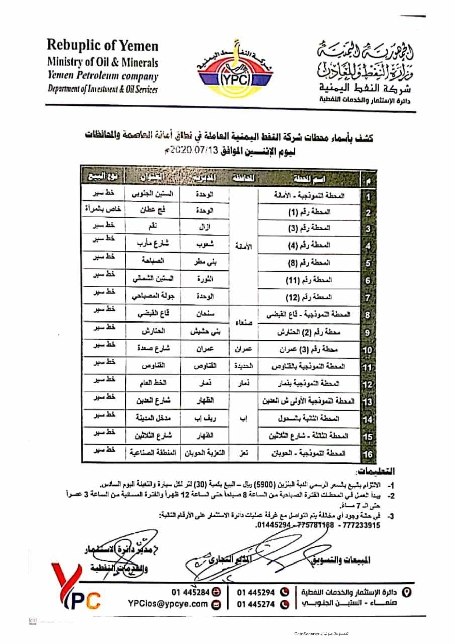 نشرت شركة النفط اليمنية كشوفات بأسماء المحطات التابعة للشركة العاملة في نطاق امانة العاصمة والمحافظات “بنزين” ليوم الاثنين 13 يوليو 2020م .