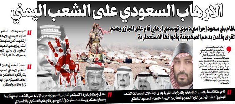 إرهاب العدو السعودي وجرائمه بحق الشعب اليمني ليست وليدة اليوم بل تعود الى بداية الدولة السعودية الاولى عندما قام محمد بن سعود بغزو نجران وعسير وجيران الخاضعة تحت حكم اليمن في تلك الفترة وما قام به من قتل ونهب وتدمير قبور الصالحين وقباب المساجد, ثم محاولة سعود بن عبدالعزيز احتلال اليمن ووصل إلى زبيد ولكن شعبنا المكافح في اليمن دحره وقتل الكثير من جنده الفاسد وهرب مذعورا رغم دعم الإنكليز واليهود له،