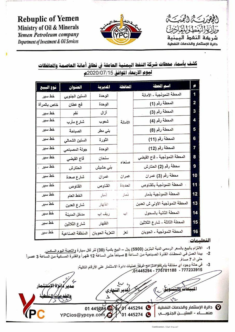 نشرت شركة النفط اليمنية كشف بأسماء المحطات التابعة للشركة والعاملة في نطاق أمانة العاصمة والمحافظات “بنزين+ديزل” ليوم الاربعاء 15 يوليو 2020م .