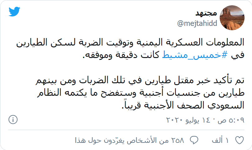 وقال “مجتهد” في تغريدة أخرى: “المعلومات العسكرية اليمنية وتوقيت الضربة لسكن الطيارين في #خميس_مشيط كانت دقيقة وموفقه”.