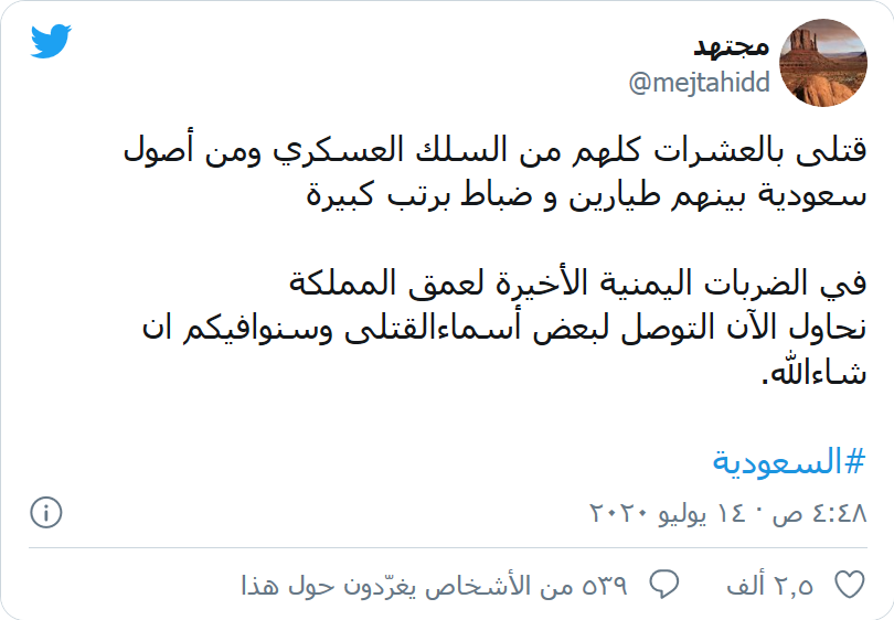وأكد “مجتهد” في تغريدة أخرى أن هناك قتلى بالعشرات كلهم من السلك العسكري ومن أصول سعودية بينهم طيارين و ضباط برتب كبيرة، مستدركا: “نحاول الآن التوصل لبعض أسماء القتلى وسنوافيكم إن شاء الله”.