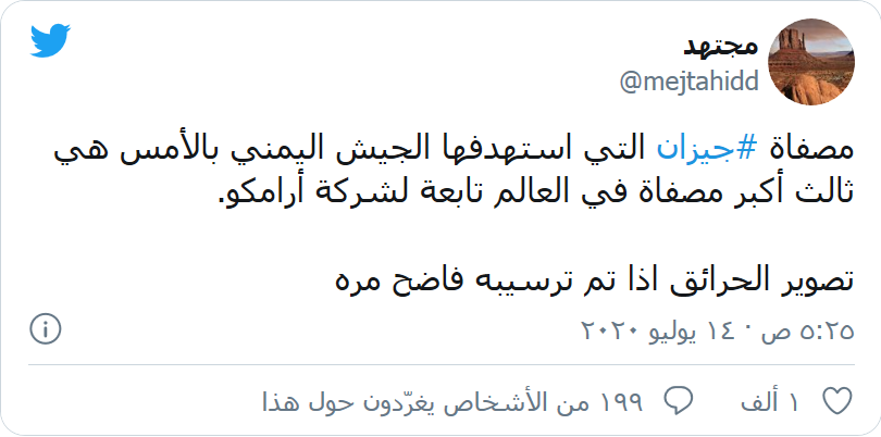 وذكر أن القصف اليمني استهدف مصفاة #جيزان – ثالث أكبر مصفاة في العالم – تابعة لشركة أرامكو السعودية. وقال إن “تصوير الحرائق اذا تم تسريبه فاضح أمره”.