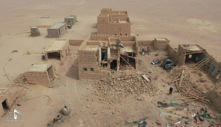 فريق إعلامي وحقوقي يزور مسرح المجزرة التي ارتكبها طيران العدوان في الجوف