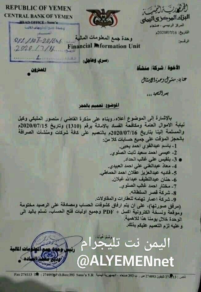 وبحسب مذكرة صادرة عن البنك المركزي اليمني حصل “يمني برس” على نسخة منها، وجهت وحدة جمع المعلومات بالبنك شركات الصرافة بحجز حسابات وأموال سبعة أشخاص وشركتين للأسهم الوهمية، وذلك عقب تلقيه مذكره رسمية من نيابة الأموال العامة ومكافحة الفساد، وهي كالتالي: