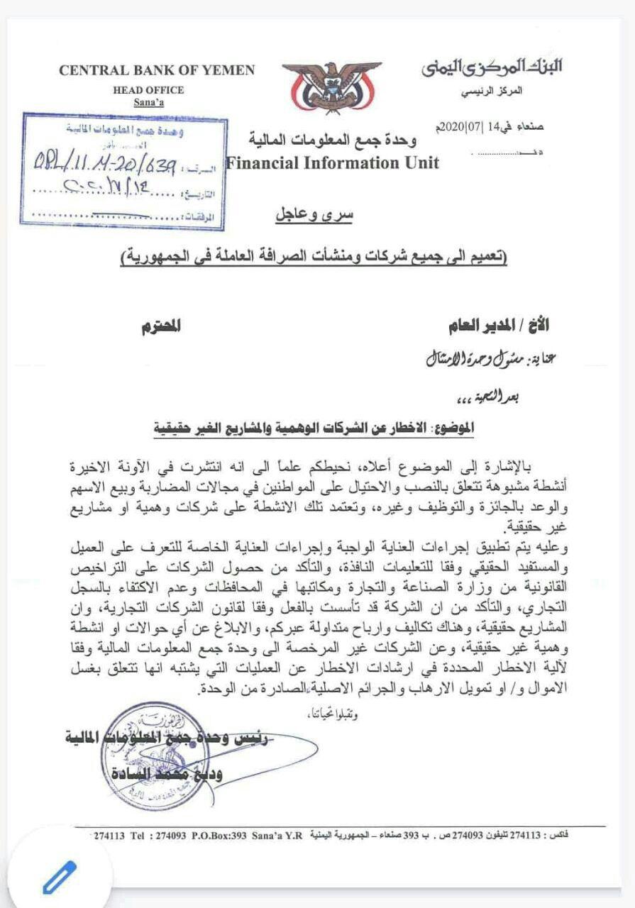 أصدر البنك المركزي اليمني في صنعاء قراراً وتعميماً هاماً لجميع شركات ومنشآت الصرافة بحجز أموال أشخاص وشركات تنشط في بيع الأسهم الوهمية للنصب والإحتيال على المواطنين.