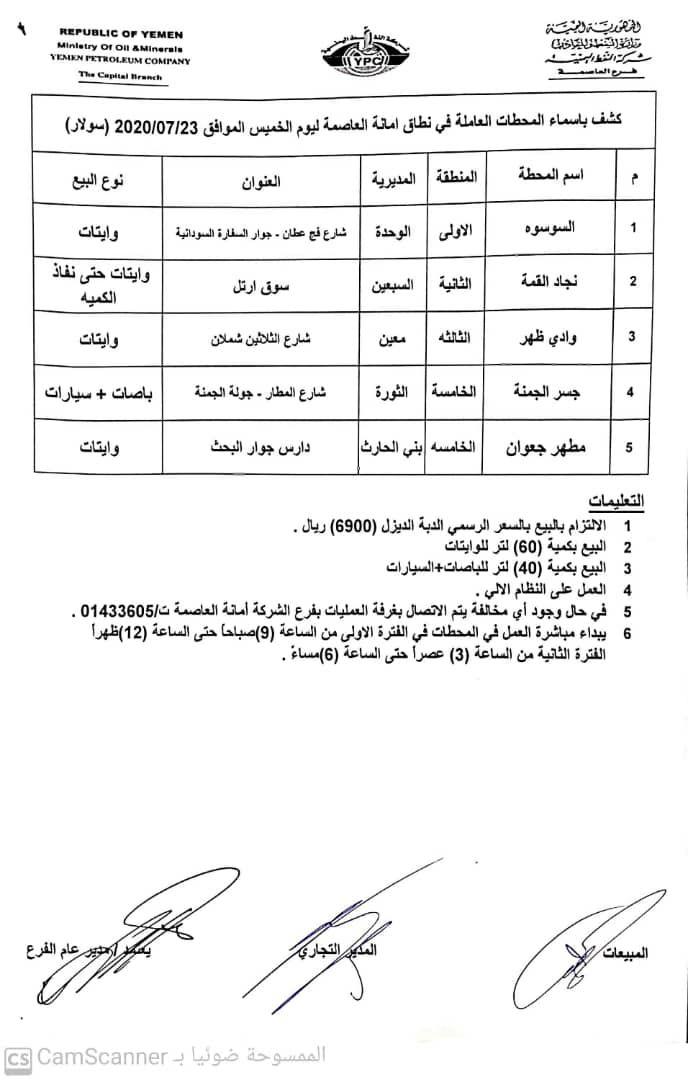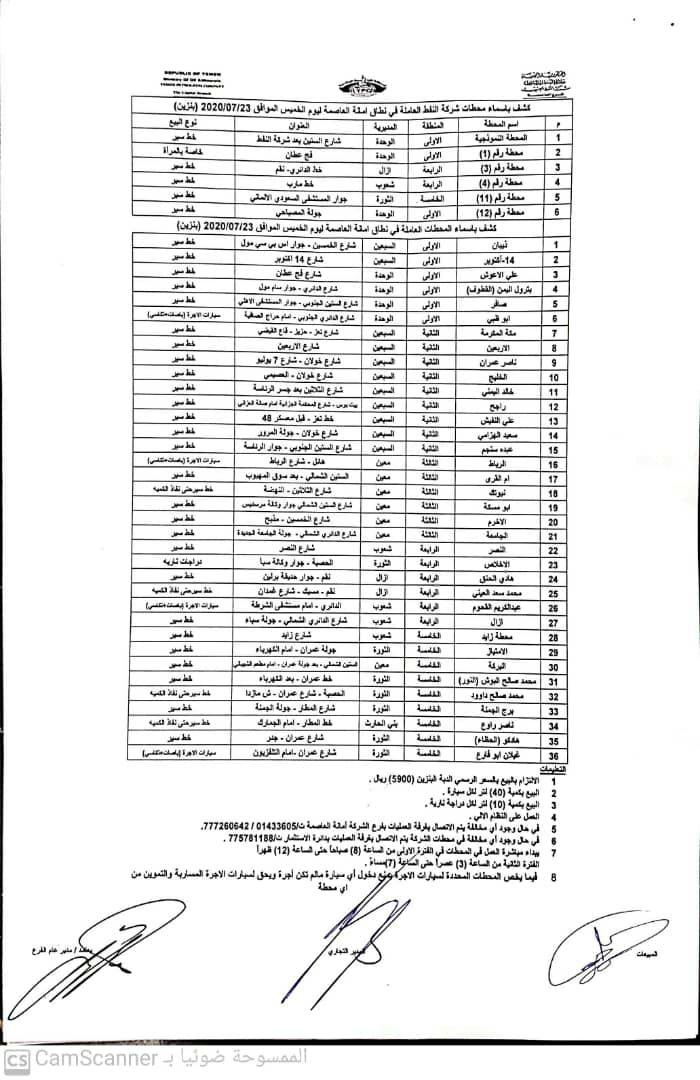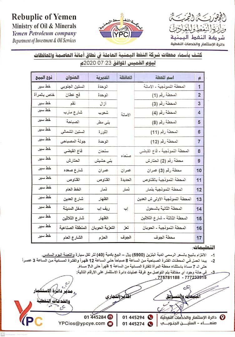نشرت شركة النفط اليمنية كشوفات بأسماء المحطات التابعة لها والعاملة في نطاق امانة العاصمة والمحافظات وكذلك المحطات العاملة في أمانة العاصمة الغير تابعة للشركة ليوم الخميس 23 يوليو 2020م .
