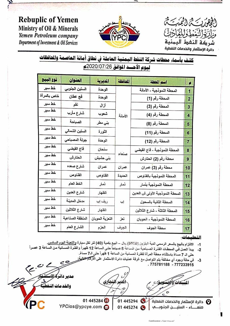 نشرت شركة النفط اليمنية كشوفات بأسماء المحطات التابعة لها والعاملة في نطاق امانة العاصمة والمحافظات “بنزين” ليوم الاحد 26 يوليو 2020م.