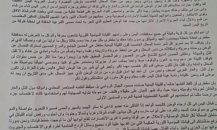 وأشَارَ إلى أن محافظةَ سقطرى لن تلفظَ أنفاسَها طالما والقبيلةُ اليمنية صامدةٌ صمودَ الجبال الرواسي، لكن سيلفُظُ أنفاسَه المستعمرُ المعتدي وأدواته من دول الذل والعار والخائن لعروبته وقوميته ودينه وقد ظهر للعيان على حقيقته وكشف عن سوأَتِه بتوليه الصهاينة التي استخدمته كأداةٍ لاغتصاب جُزءٍ من الوطن مثلما تم استخدامه في القضية الفلسطينية قضية العرب والمسلمين الأولى.
