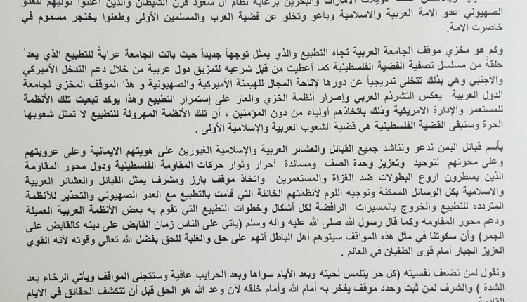 قبائل اليمن تدين خيانة الإمارات والبحرين للأمة بتطبيعهما مع الصهاينة