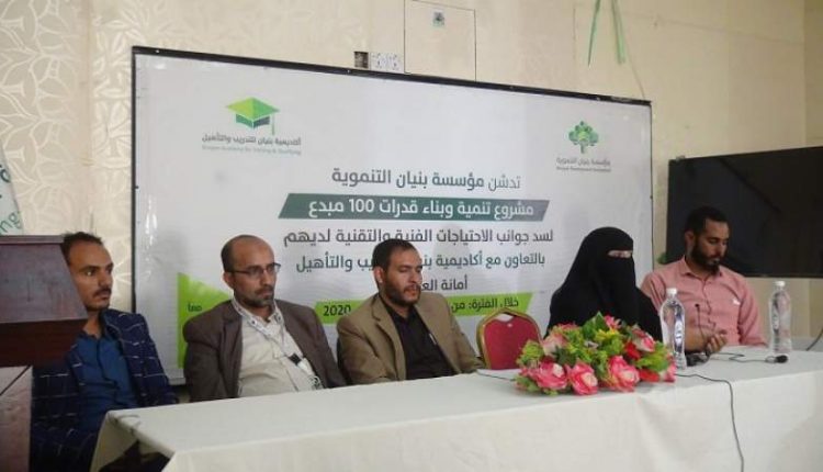 بدأت اليوم الثلاثاء بأكاديمية بنيان للتدريب والتأهيل بصنعاء، دورة تدريبية لبناء قدرات الشباب المبدعين والمبتكرين في الجوانب الفنية والتقنية، تنظمها مؤسسة بنيان التنموية.
