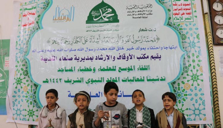 كما نظمت إدارة الأوقاف والإرشاد بمديرية صنعاء القديمة، اليوم لقاءً موسعاً للعلماء وخطباء المساجد احتفاءً بذكرى المولد النبوي.