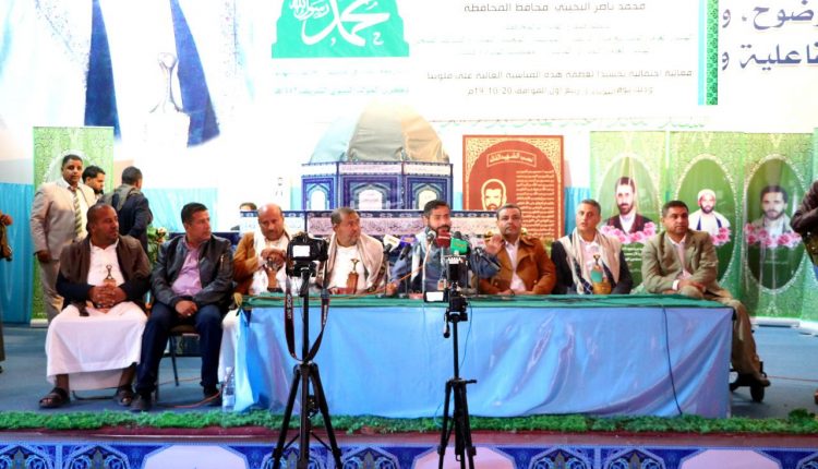 ولفت في الفعالية التي حضرها وكيلا المحافظة محمود الجبين وعباس العمدي وعدد من أعضاء المكتب التنفيذي والإشرافي، إلى أهمية الإقتداء بالنبي الكريم في مواجهة العدوان.. حاثا الجميع على المشاركة الفاعلة في الفعالية المركزية للاحتفاء بهذه المناسبة، ودعم المرابطين في الجبهات.