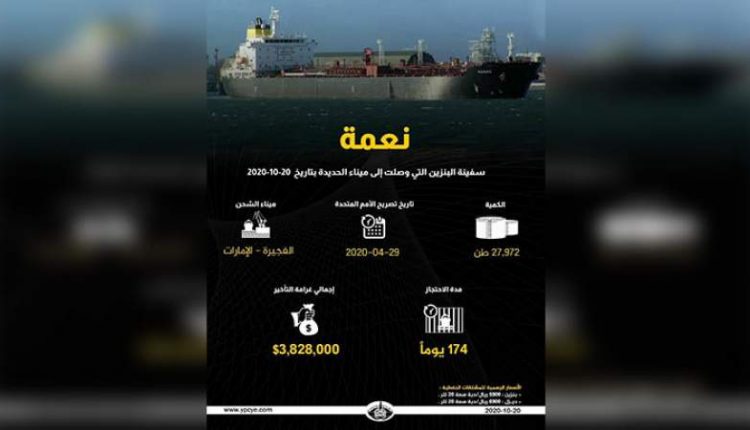 وأوضحت الشركة في صفحتها على “فيسبوك” أن السفينة “نعمة” والتي وصلت الى ميناء الحديدة اليوم محملة 27.972 بنزين.