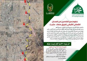 (ب) مديرية نهم: وحدد لهم الوصول إلى جولة آية ومنها الاتجاه شرقا عبر شارع النصر حتى نهايته مرورا بمدينة سعوان ومنه حتى جسر شيراتون ومنه إلى الخط الدائري الشرقي والسير فيه على امتداده حتى جولة وجسر العمري والدخول منه إلى شارع خولان والاتجاه جنوبا حتى جولة البنك الوطني والاتجاه منها يمين نحو شارع 45 والسير عبره على امتداده إلى نهاية جسر السائلة والدخول منه إلى الموقف الشرقي للجامع وإيقاف السيارات فيه بطريقة منتظمة ومرتبة.