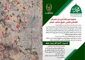 وحدد لهم الوصول إلى جولة الجمنة والاتجاه منها غربة عبر شارع الستين والسير فيه على امتداده مرورا من نفق جولة عمران ومن جسر مذبح ونفق عصر- وصولا إلى نفق المصباحي والخروج من النفق والانعطاف يمين نحو الموقف مباشرة والدخول للموقف الجنوبي الغربي لميدان السبعين بحيث تأخذ مواقعها بالموقف بطريقة صحيحة ومنظمة.