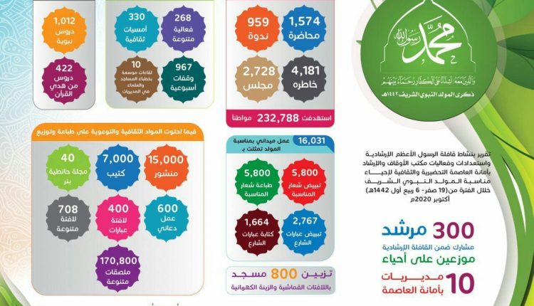 وحسب إحصائية صادرة عن مكتب الأوقاف والإرشاد بأمانة العاصمة فان الفعاليات والأنشطة التي نفذها خلال الفترة من 19 صفر – 7 ربيع أول 1442هـ تمثلت في عقد لقاء عشرة لقاءات موسعة للخطباء والعلماء، و286 فعالية، و330 أمسية، و9 967 وقفة إحتجاجية أسبوعية.