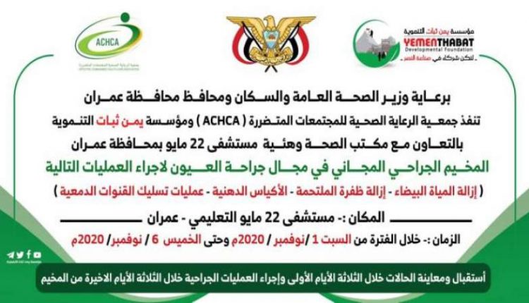 تدشن جمعية الرعاية الصحية للمجتمعات المتضررة ومؤسسة يمن ثبات التنموية بالتعاون مع مكتب الصحة العامة والسكان ومستشفى 22 مايو بمحافظة عمران غدًا السبت المخيم الطبي المجاني في جراحة العيون.