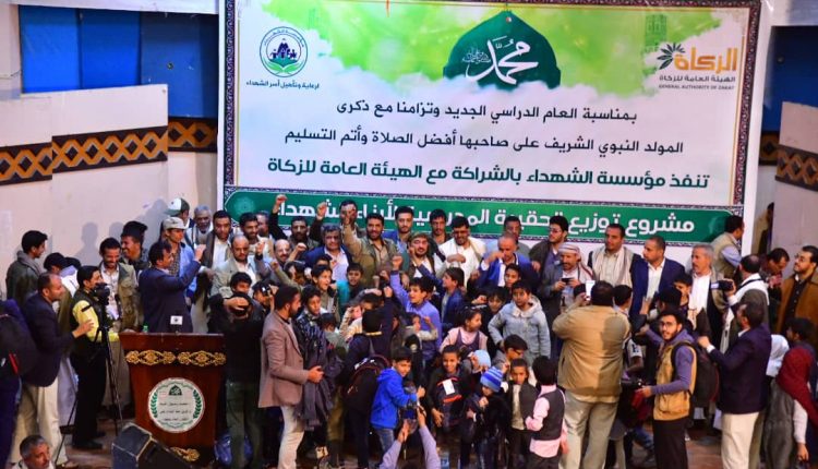 دشنت مؤسسة الشهداء بالشراكة مع الهيئة العامة للزكاة اليوم بصنعاء، مشروع توزيع الحقيبة المدرسية على أبناء الشهداء والأيتام في عموم المحافظات بمناسبة العام الدراسي الجديد وبالتزامن مع ذكرى المولد النبوي الشريف .