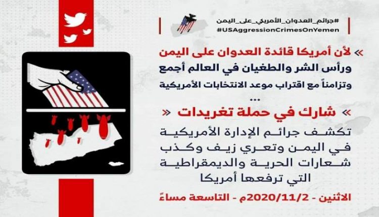 تنطلق مساء اليوم الاثنين، حملة تغريدات تكشف جرائم الإدارة الأمريكية في اليمن وتعري زيف وكذب شعارات الحرية والديمقراطية التي ترفعها أمريكا.