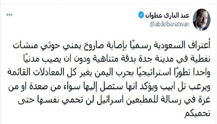 اعتبر الكاتب الكبير عبد الباري عطوان رئيس تحرير صحيفة رأي اليوم ان اعتراف السعودية رسميًا باصابة الصاروخ اليمني المجنح قدس 2 لمنشأة نفطية في مدينة جدة بدقة متناهية ودون ان يصيب مدنيًا واحدا يعد تطورًا استراتيجيًا في الحرب على اليمن.