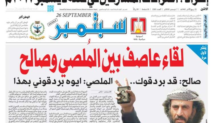 تنشر صحيفة 26 سبتمبر بنسختها الورقية في عددها الاثنين (غداً) تفاصيل لقاء عاصف جمع الرئيس الاسبق علي صالح بالشهيد البطل حسن الملصي اضافة الى اعترافات المشاركين في فتنة ديسمبر وهي الاعترافات التي وثقتها الاجهزة الأمنية.