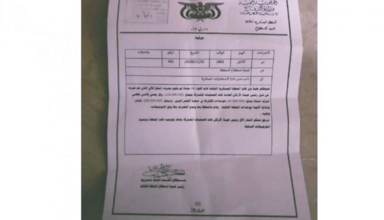 وجاء في الوثيقة الموجهة من وزارة الدفاع التابعة لحكومة الخونة، أن قائد ما يسمى بـ”المنطقة العسكرية الثالثة”، الخائن منصور ثوابة، قام بالسطو على 150 مليون ريال صرفت من بتوجيهات من الخائن “صغير بن عزيز”ـ رئيس ما يسمى بـ”هيئة الأركان” من مخصصات المجندين المرتزقة التابعين للمنطقة.
