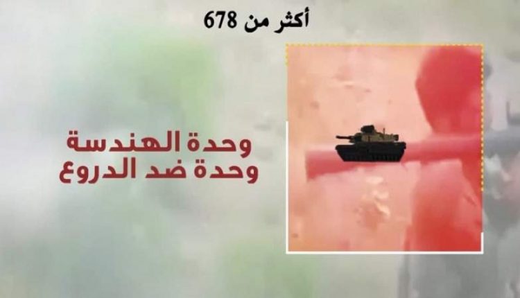 وأوضح العميد سريع أن إجمالي عمليات ضد الدروع بلغت أكثر من 678 عملية منها، استهداف أكثر من 101 آليات عسكرية محملة بالأفراد والعتاد العسكري، وأكثر من 35 مدرعة و20 دبابة و21 جرافات وعربات عسكرية و88 عملية استهداف لأسلحة ثقيلة ورشاشات، بالإضافة لـ 413 عملية استهداف لتحصينات وتجمعات العدو.