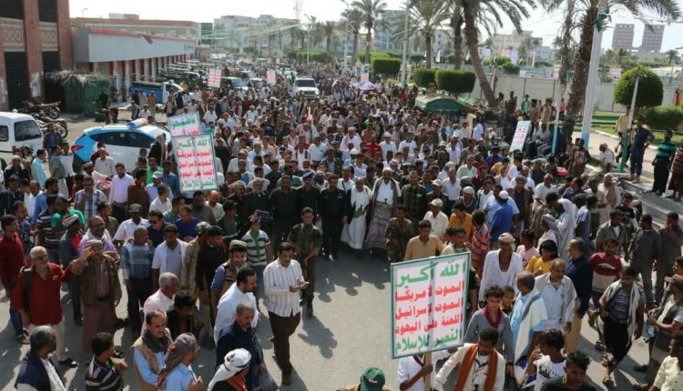 وقفة ومسيرة جماهيرية حاشدة لأبناء الحديدة للتنديد بخروقات وتصعيد العدوان