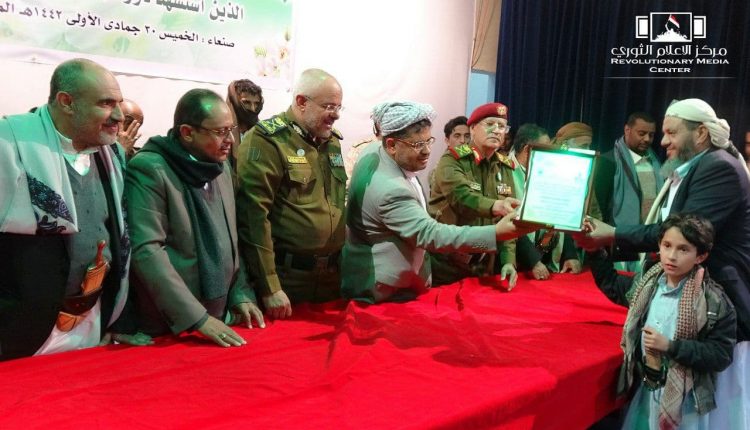وفي ختام الحفل الذي تخلله قصيدة للشاعر عبدالباري عبيد بعنوان “مواقف مشرفة” كرم عضو السياسي الأعلى الحوثي ومساعد وزير الدفاع ووكيل وزارة الداخلية ونائب المدير التنفيذي لمؤسسة الشهداء، أسر الشهداء بدروع وهدايا عينية.