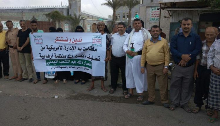 وأستنكر بيان صادر عن الوقفة قرار الرئيس الإمريكي ترامب المنتهية ولايته بتصنيف أنصار الله كمنظمة ارهابية.
