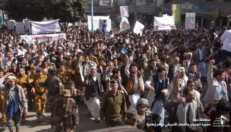 مسيرات حاشدة في محافظة حجة رفضا للتصنيف الأمريكي وجرائم العدوان والحصار