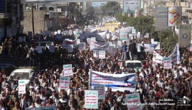 مسيرة جماهيرية حاشدة بمدينة ذمار رفضاً واستنكارًا للإرهاب الأمريكي بحق الشعب اليمني