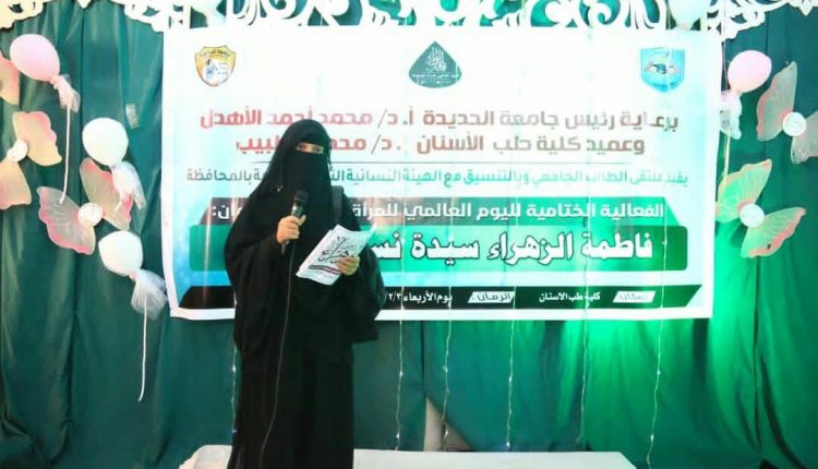 إحياء الفعالية الختامية لليوم العالمي للمرأة المسلمة تحت عنوان ” فاطمة الزهراء سيدة نساء العالمين” بكلية طب الاسنان جامعة الحديدة