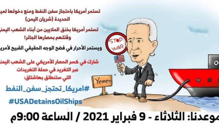 وتأتي التغريدات التي تنطلق التاسعة مساء لتعريف العالم بما تقوم به دول العدوان وعلى رأسها أمريكا في احتجاز سفن النفط ومنع دخولها لميناء الحديدة وما يسببه ذلك من حصار خانق ع بحق الملايين من أبناء الشعب اليمني وقتلهم بهذا الحصار الجائر.