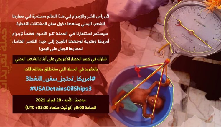 ودعا المنظمون إلى المشاركة الواسعة في حملة التغريدات لكسر الحصار الأمريكي على الشعب اليمني “تحت هاشتاغ: