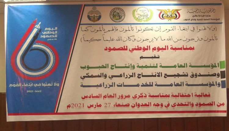 نظمت المؤسسة العامة لتنمية وإنتاج الحبوب وصندوق تشجيع الإنتاج الزراعي السمكي والمؤسسة العامة للخدمات الزراعية اليوم فعالية احتفالية بذكرى مرور ستة أعوام من الصمود والتحدي في وجه العدوان.