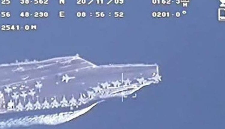 بثت قناة “برس تي في “مقاطع فيديو لطائرة مسيرة إيرانية تحلق فوق حاملة طائرات أمريكية في مياه الخليج.