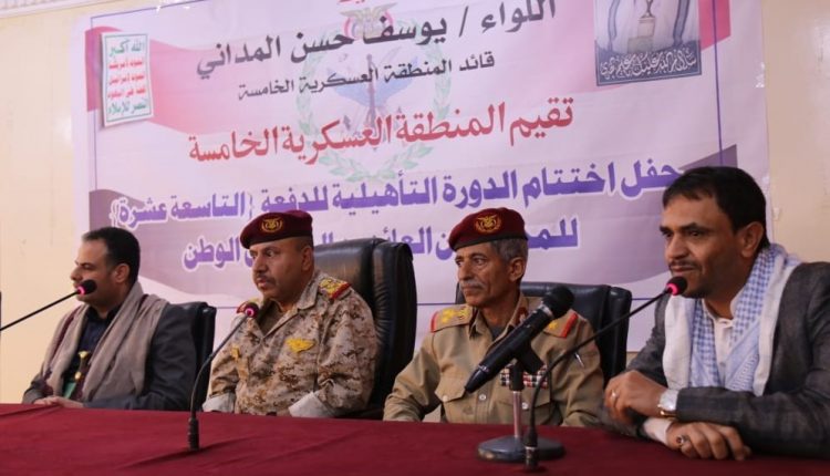 نظمت قيادة المنطقة العسكرية الخامسة اليوم بصنعاء حفل اختتام الدورة التأهيلية الـ 19 لعدد 54 من المغرر بهم من أبناء محافظتي حجة والحديدة الذين تركوا القتال الى جانب المعتدين وفضلوا العودة الى الصف الوطني.