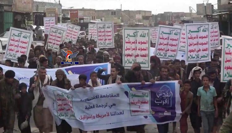 وأكد المشاركون في المسيرة أن موقف الشعب اليمني تجاه القضية الفلسطينية نابع من هويته الإيمانية وأصالته وهو مستمر على موقفه في مناصرة الفلسطينيين والسعي لتحرير فلسطين والمقدسات والأراضي العربية المحتلة.